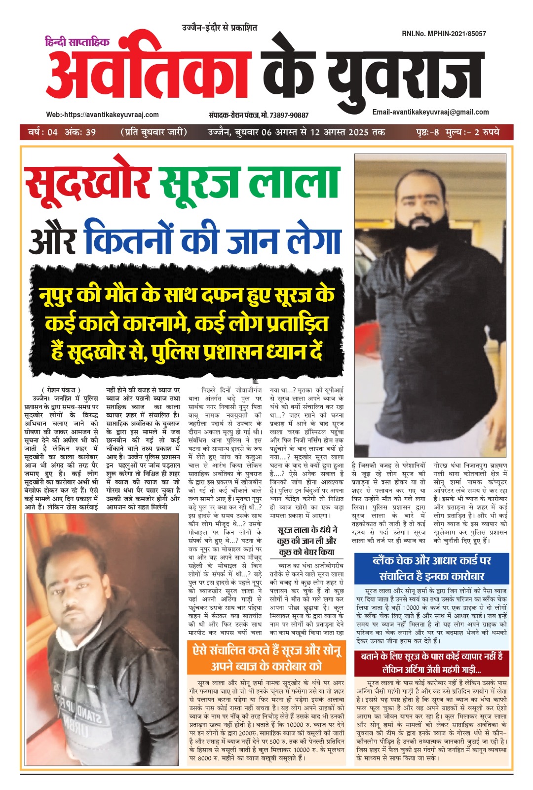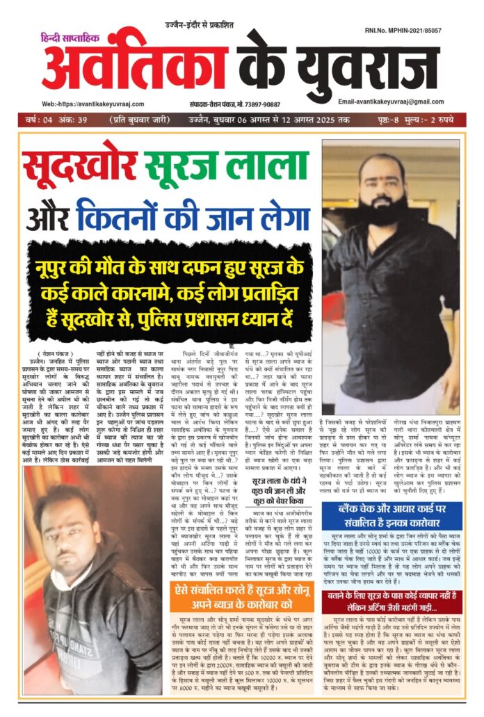 अवन्तिका के युवराज उज्जैन/ सूरज लाला और कितनों की जान लोगे नामक शीर्षक से आज साप्ताहिक अवंतिका के युवराज समाचार पत्र में खबर प्रकाशित कर जिला प्रशासन और पुलिस प्रशासन का ध्यान शहर में कुकुरमुत्ता की तरह पनप चुके सूदखोरों की ओर आकृष्ट करवाने का प्रयास किया था, खबर का असर देखने को भी मिला एक फरियादी सूदखोर सोनू शर्मा के खिलाफ फरियाद लेकर नीलगंगा थाने पहुंचा भी। पुलिस की मौजूदगी में ही फरियादी को सूदखोर सोनू शर्मा फोन पर धमकाता रहा तब पुलिस ने फरियादी को कहा कि वह उसे बुला ले तब उसे घर पर आने का कहा गया इस पर सूदखोर सोनू शर्मा कृष्णा पार्क कॉलोनी में पैसे की वसूली के लिए पहुंच गया और फरियादी को फिर फोन मिलाकर यहां पहुंचने की सूचना दी और आने के लिए दबाव बनाया। जैसे ही फरियादी यहां पहुंचा सोनू उस पर लपक पड़ा लेकिन पुलिस ने हस्तक्षेप कर सूदखोर सोनू शर्मा को हिरासत में ले लिया और थाने ले आए। जहां थाना प्रभारी तरुण कुरील के समक्ष दोनों पक्षों की सुनवाई हुई और सूदखोर पर पुलिस ने मेहरबानी दिखाते हुए फरियादी की फरियाद को नकारकर 20-20 हजार रुपए के दो चेक बनाकर 2 माह सूदखोर को देने के लिए दबाव बना दिया वहीं सुदखोर के पास फ़रियादी के ब्लैंक चेक थे उन्हें वापस लौटाने के लिए कहकर मामले को ऊपर के ऊपर ही निपटा दिया। हालांकि इस मामले में सुबह दोनों पक्ष को एक बार फिर थाने पर बुलवाया गया है।