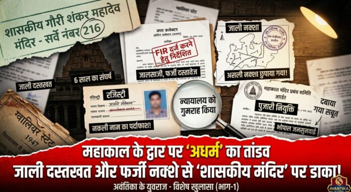 उज्जैन। धर्मधानी उज्जैन में जहाँ सत्य का बोलबाला होना चाहिए, वहाँ भू-माफियाओं ने न्याय की देवी की आँखों पर पट्टी बाँधने का दुस्साहस कर डाला है। अवंतिका के युवराज की पड़ताल में यह सनसनीखेज तथ्य सामने आया है कि शासकीय गौरी शंकर महादेव मंदिर (सर्वे नंबर 216) की करोड़ों की भूमि को हड़पने के लिए षड्यंत्रकारियों ने न केवल जाली नक्शे गढ़े बल्कि उन पर फर्जी सील और अधिकारियों के जाली हस्ताक्षर ठोक कर उसे माननीय न्यायालय के समक्ष पेश कर दिया। सूत्रों की मानें तो जब पीड़ित पक्ष ने ओरिजिनल नक्शा कोर्ट के सामने रखा तो इन नकाबपोश अपराधियों की बोलती बंद हो गई और उनका रचित झूठ का किला ढहने लगा। सवाल यह खड़ा होता है कि जो लोग न्याय के मंदिर के साथ छल कर सकते हैं, वे समाज के लिए कितने घातक होंगे….?